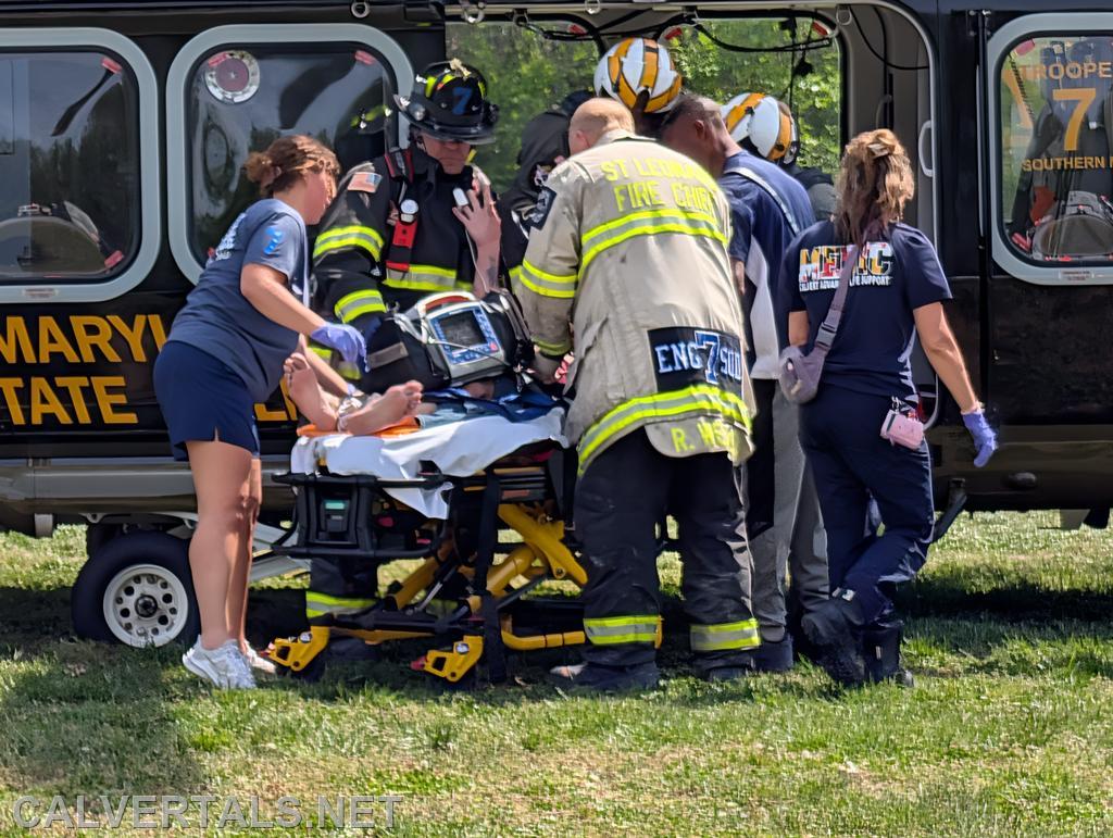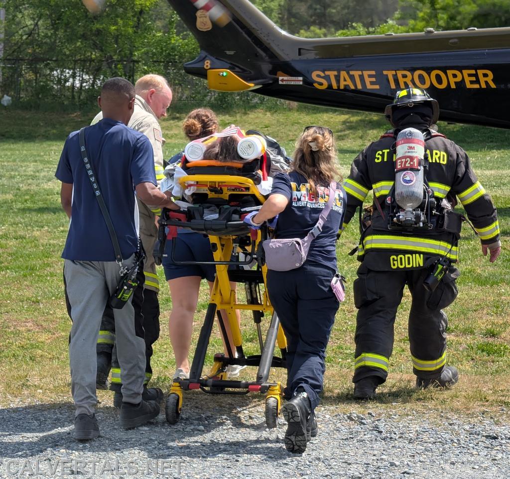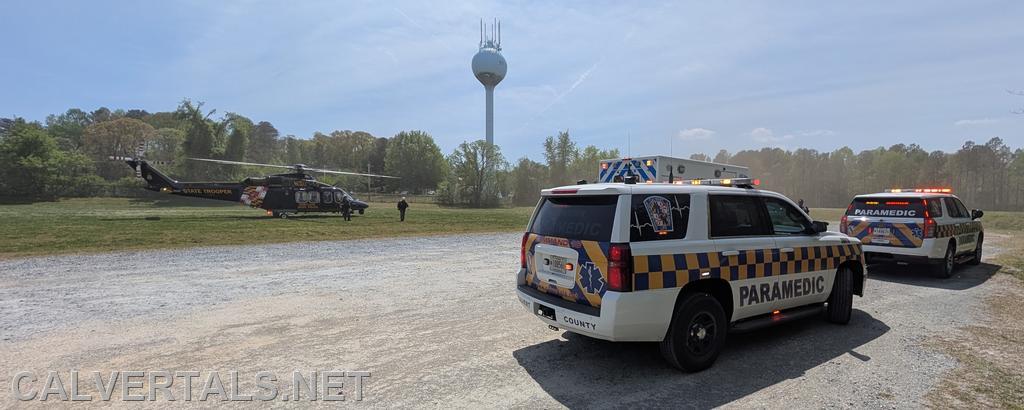 On Wednesday, CALS units responded to St-Leonard to assist A78 with a person who had been injured in a long fall. PMIC Winchell (M104) worked with the crew of A78 to assess the patient and prepare them for transport to a local trauma facility. Maryland State Police Trooper 7 landed in a field behind Company 7 and assumed responsibility for patient care.